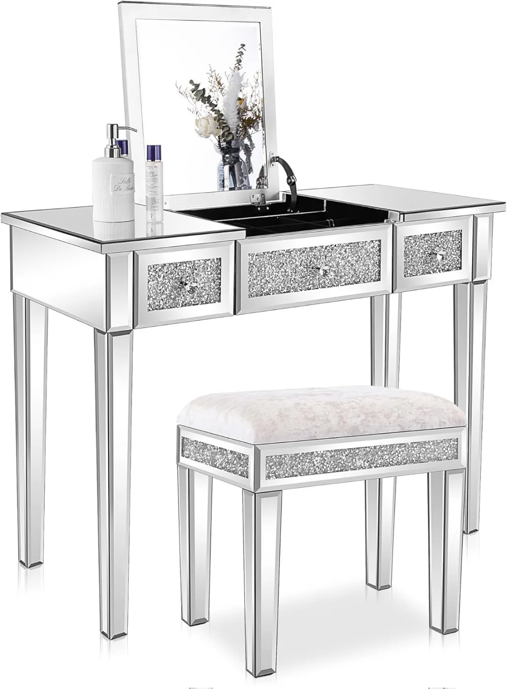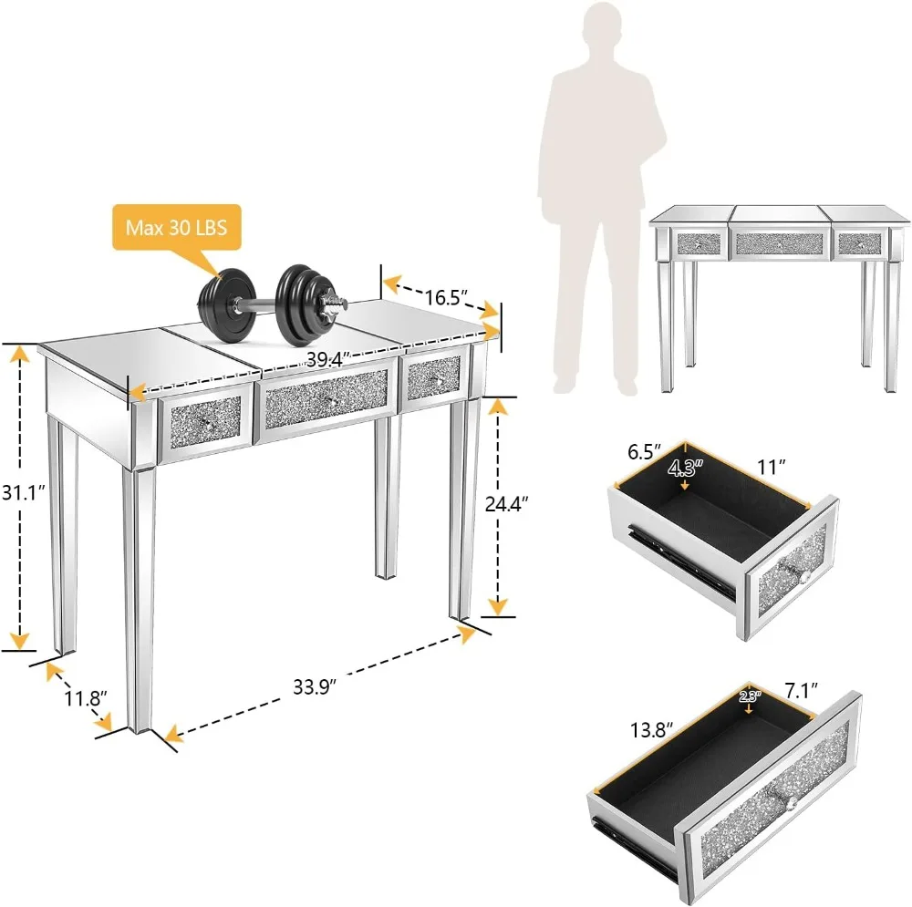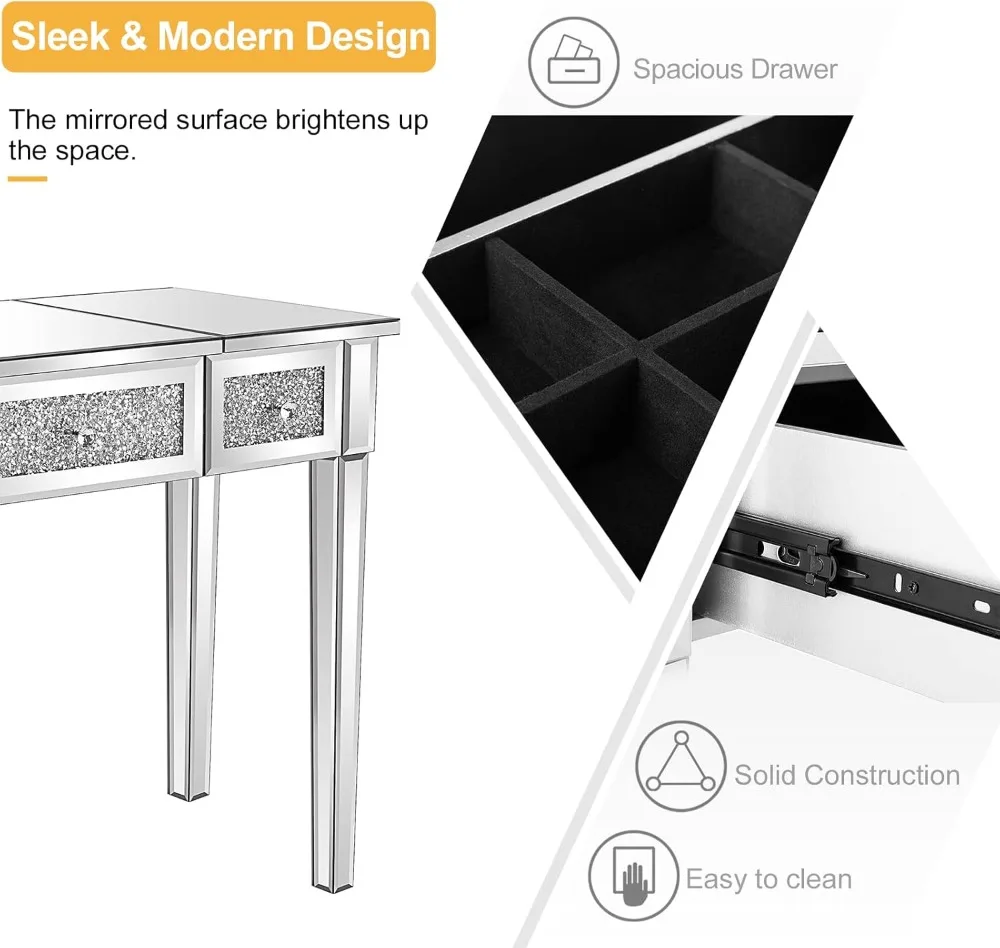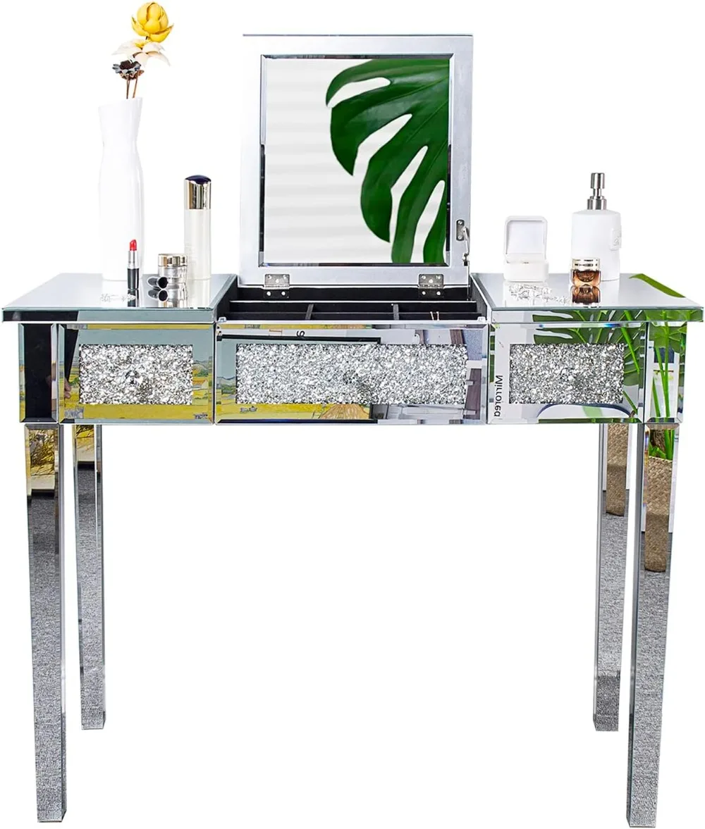 Welcome to Household Harmony Mart, where elegance and functionality enhance your beauty space. This Mirrored Glass Vanity Desk features a stunning silver mirrored finish that adds a glamorous touch to any bedroom. The stylish flip mirror design allows you to easily switch between a makeup mirror and a smooth tabletop surface. Built-in drawers provide convenient storage for cosmetics, jewelry, and beauty essentials. The reflective glass panels create a bright and luxurious appearance that complements modern décor. Perfect for women and girls who want a chic and organized makeup station. Durable construction ensures stability and long-lasting use. Add sparkle and sophistication to your bedroom with this beautiful mirrored vanity desk.