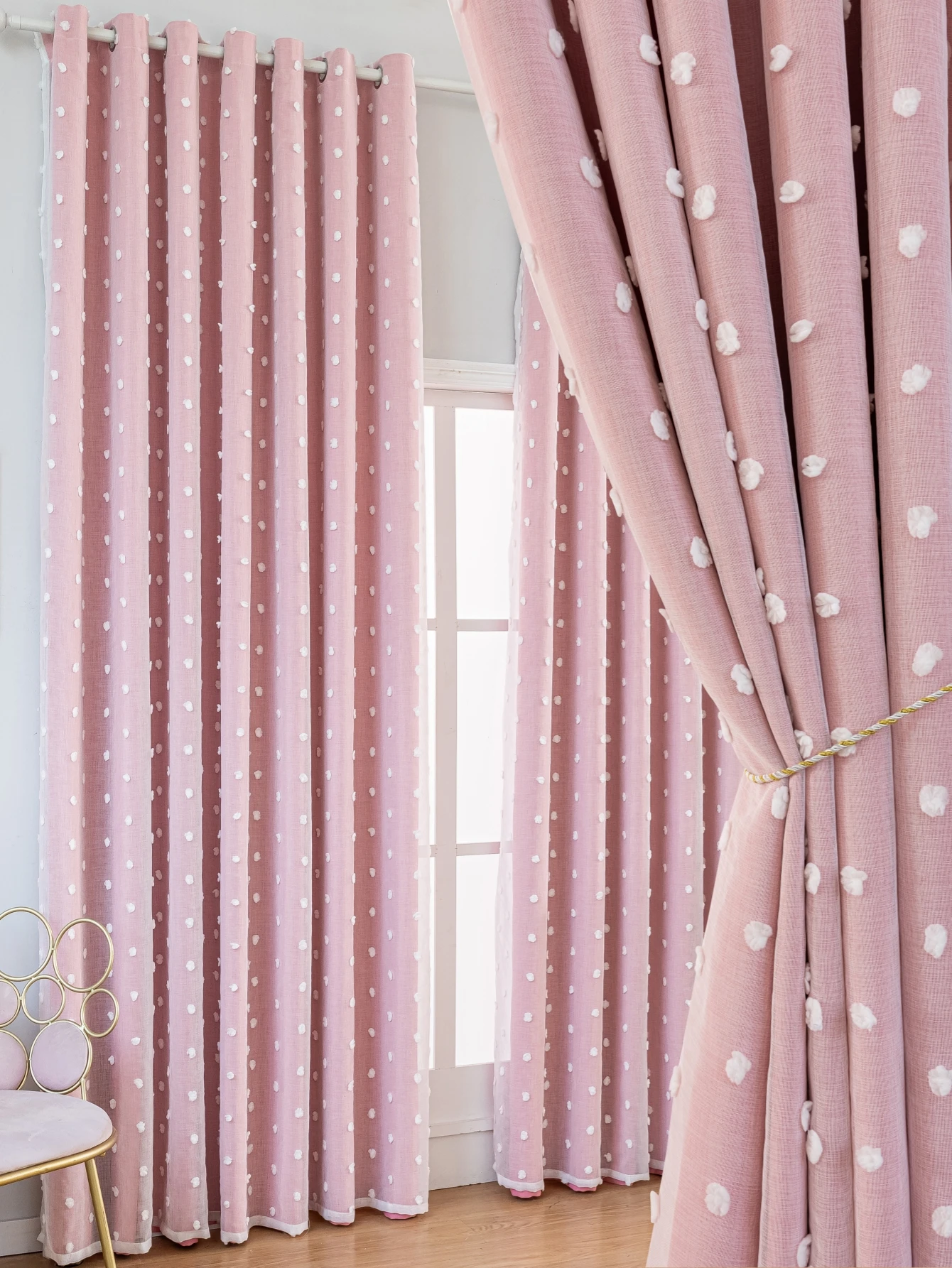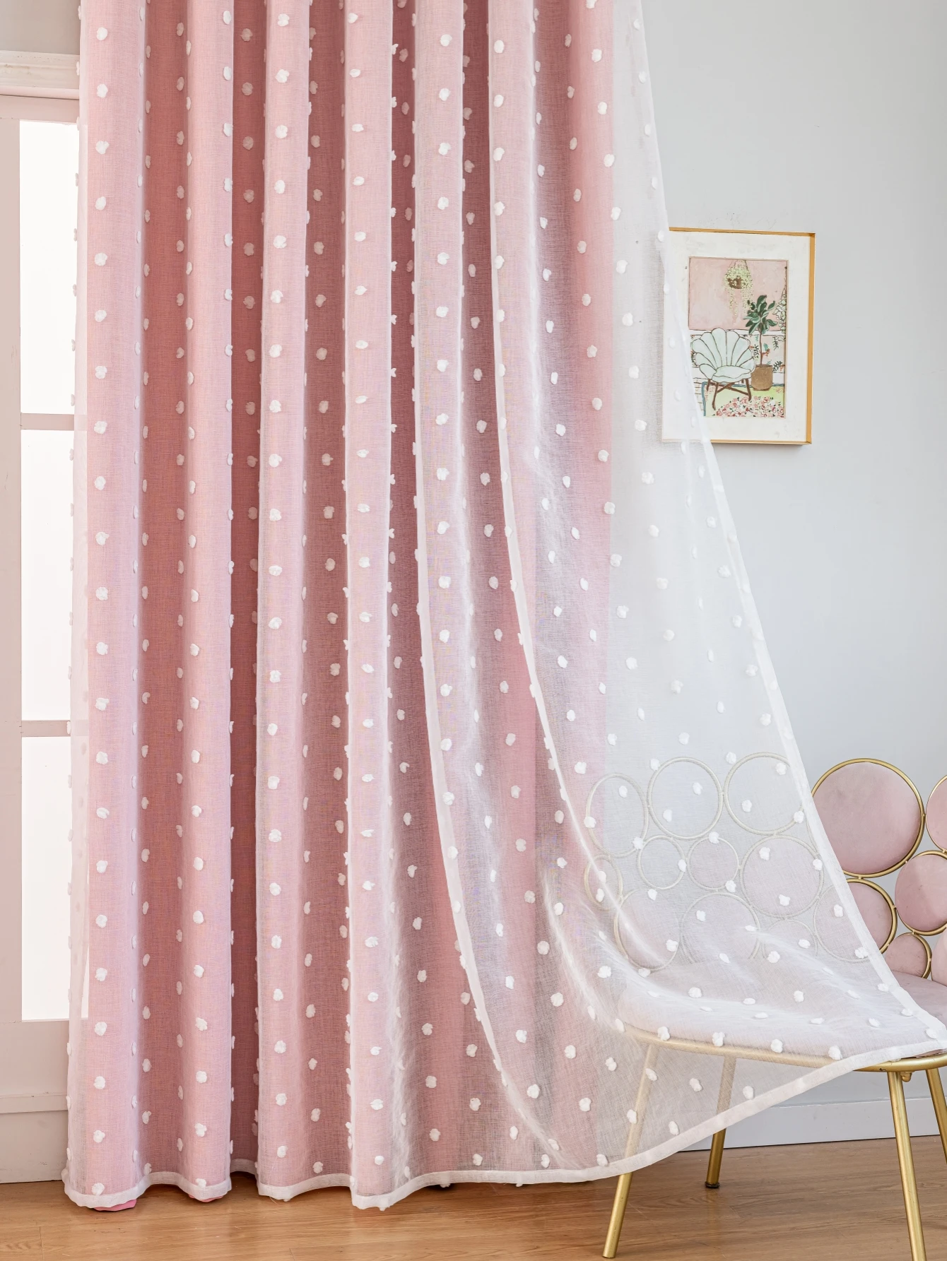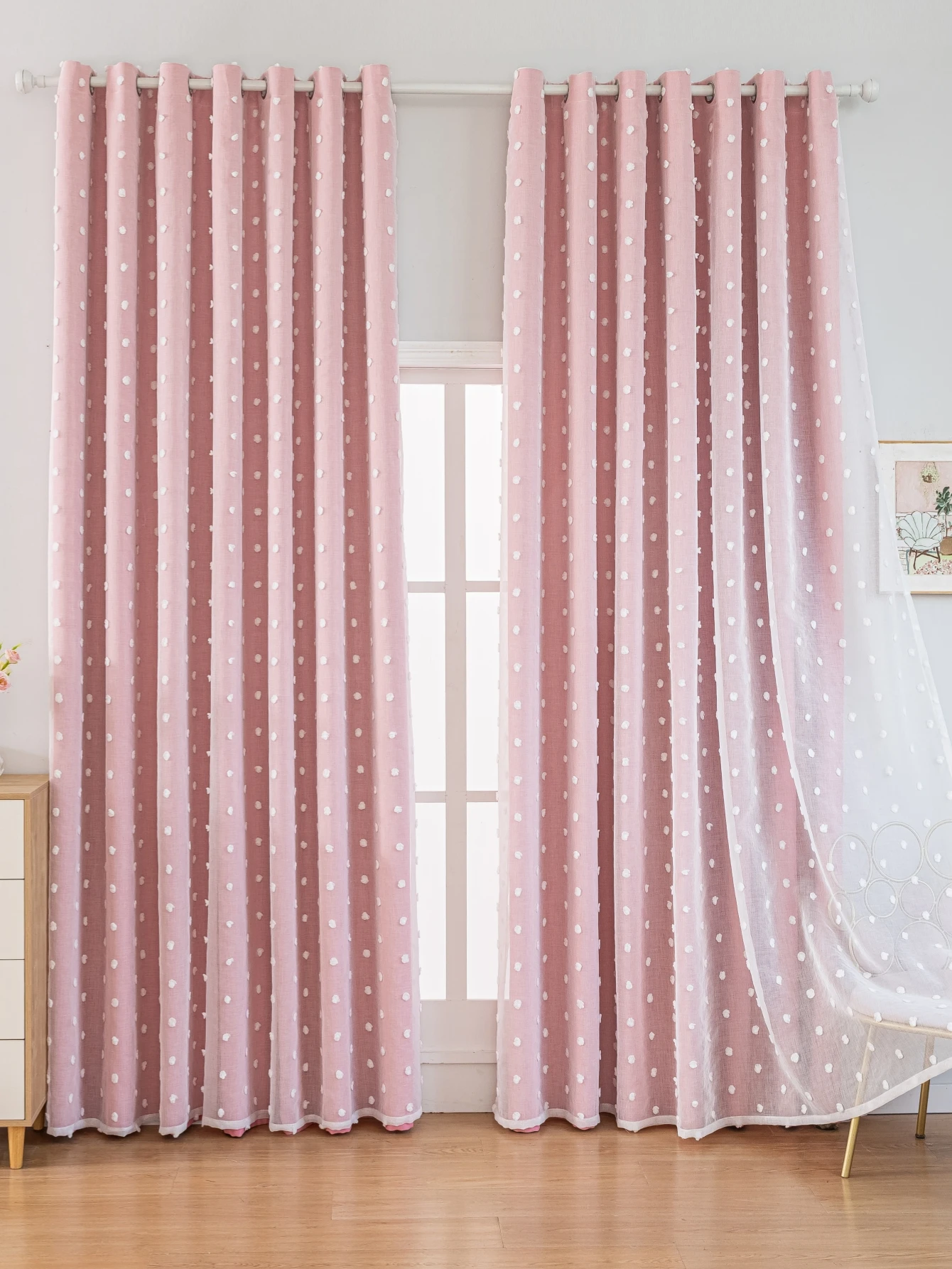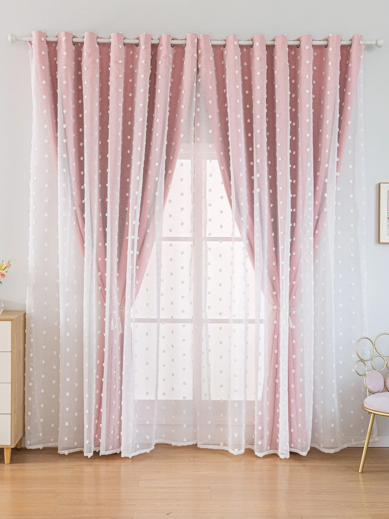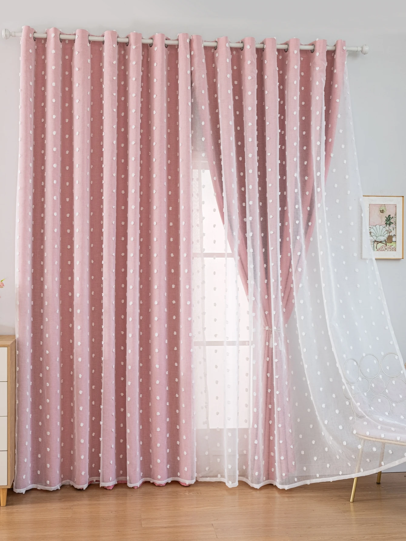 Welcome to Household Harmony Mart, where stylish décor adds charm and comfort to your home. These Pink Dot Blackout Curtains feature a beautiful double-layer design that combines functionality with elegant decoration. The blackout layer helps block sunlight and improve privacy for bedrooms and living spaces. A soft white gauze layer with perforated dot patterns adds a delicate and festive decorative touch. The layered design creates depth while allowing gentle light effects through the gauze fabric. Perfect for living rooms, bedrooms, offices, or decorative interior settings. The soft pink color brings a warm and cozy atmosphere to your space. Refresh your windows with these stylish double-layer pink blackout curtains.